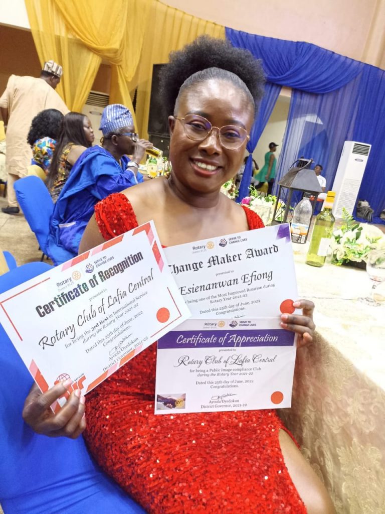 A humanitarian, Dr Efiong is a Rotarian for seven years and the Changemaker President of the Rotary Club of Lafia Central for the year 2021-2022. Under her lead as President, the club got Rotary International citation and District grant for a “Waste to wealth” project aimed at converting agricultural waste to biofuel. She also received eight Rotary Day of Service Certificates of recognition from Rotary International and three certificates from Rotary District 9125. Rotarian Esienanwan is a Paul Harris Fellow for her contribution to The Rotary Foundation.